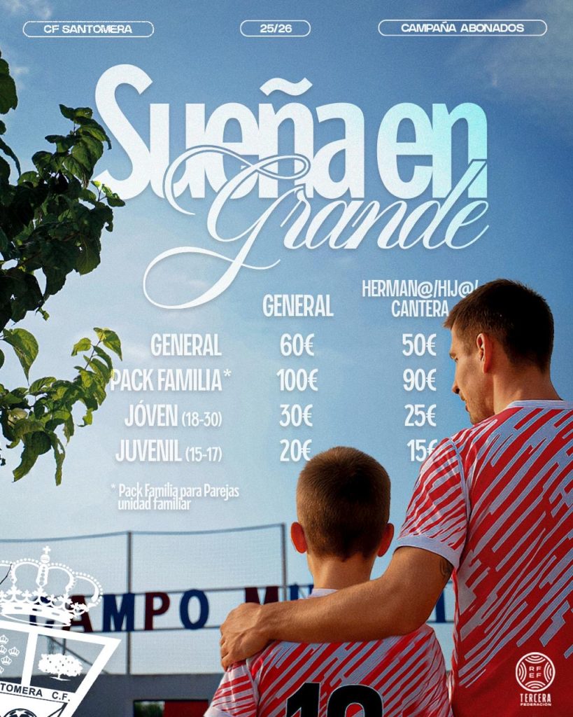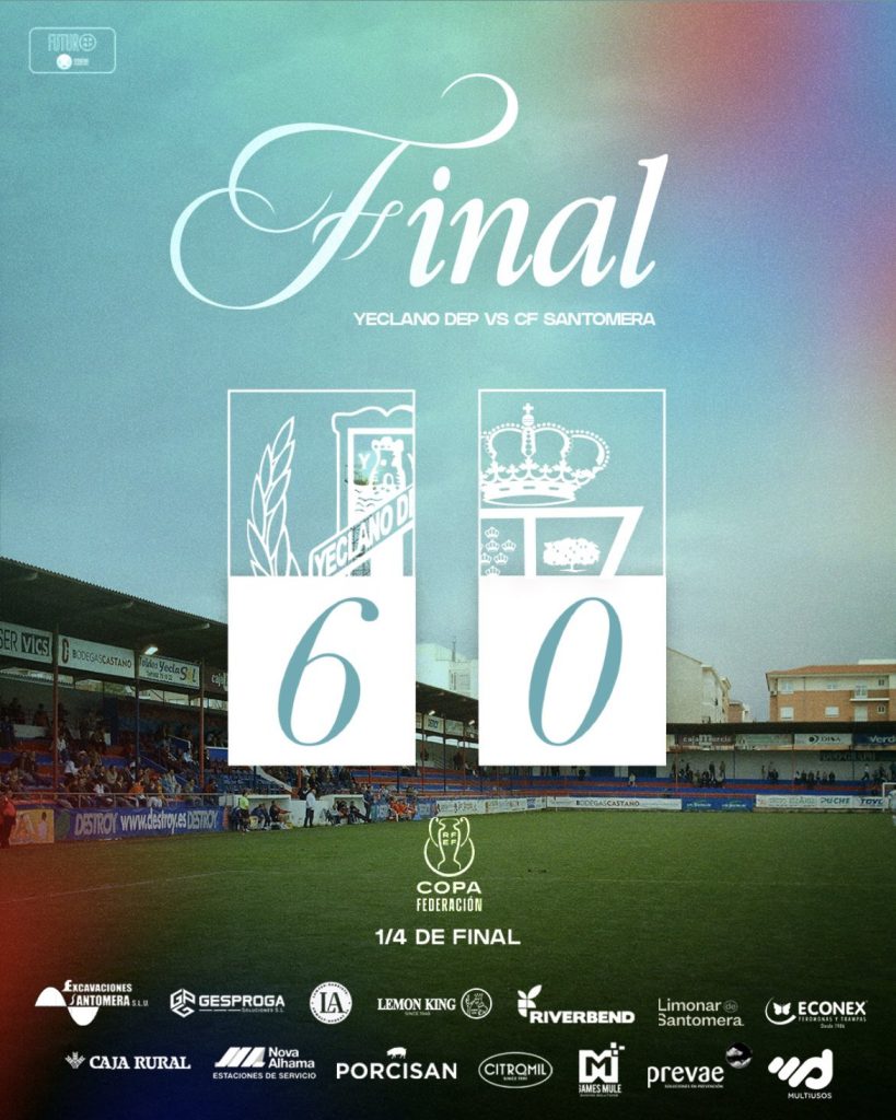 El CF Santomera comienza la temporada 2025/26 cargado de ilusión. El conjunto dirigido por Jorge Zaragoza disputará el primer partido del curso en Copa Federación. Será ante el Yeclano Deportivo este sábado 23 de agosto a las 20:00 horas en el estadio La Constitución. El partido corresponde a los cuartos de final de la fase